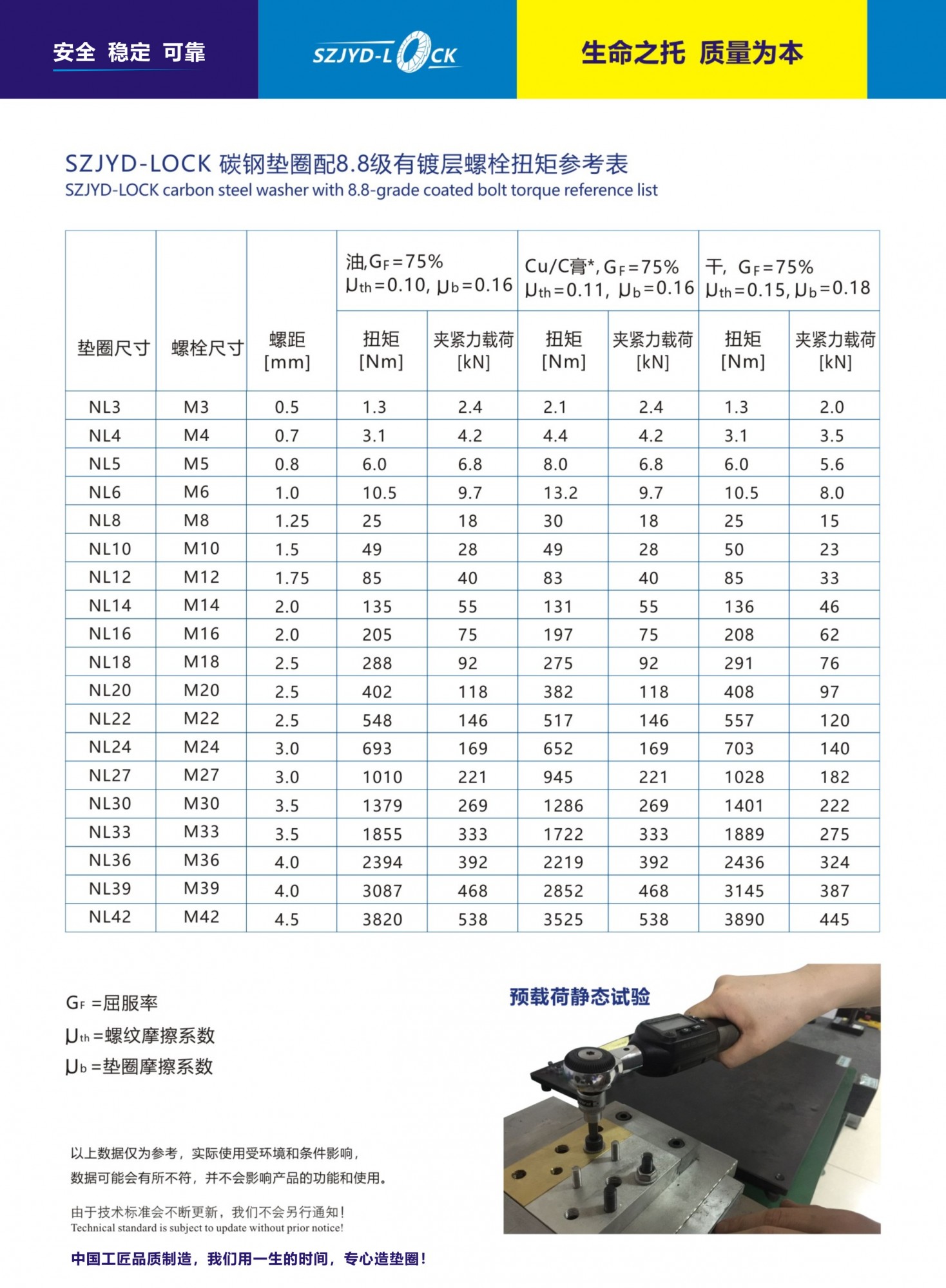 雙疊自鎖墊圈的使用:墊圈兩個大斜齒面成對粘合,目的是便於安裝和防止錯誤使用!墊圈的硬度必須高于螺栓的硬度!SZJYD-LOCK墊圈全部經(jīng)過DIN65151橫向振動測試可以達(dá)到200萬測試、其衰減率不低于70%!