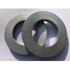 獨(dú)特的墊圈的內(nèi)側(cè)斜齒面傾斜角度 α 大于螺栓螺紋傾斜角度 β 。 裝配時, 內(nèi)側(cè)斜齒面是相對的, 墊圈外側(cè)放射狀的凸紋面 (外滾花齒面) 的摩擦系數(shù)要比內(nèi)側(cè)斜齒面 的摩擦系數(shù)大, 且與兩端接觸面成咬合狀態(tài)。 當(dāng)連接件受到振動, 并使螺栓發(fā)生松動趨勢時, 僅僅允許兩片墊圈內(nèi)側(cè)斜齒間相對抬升錯動, 產(chǎn)生擡升張力。 獨(dú)特的齒牙系統(tǒng)利用張力在緊固的 連接處產(chǎn)生壹個很高的抵抗力來經(jīng)受振動力,從而達(dá)到 100% 的防松效果。