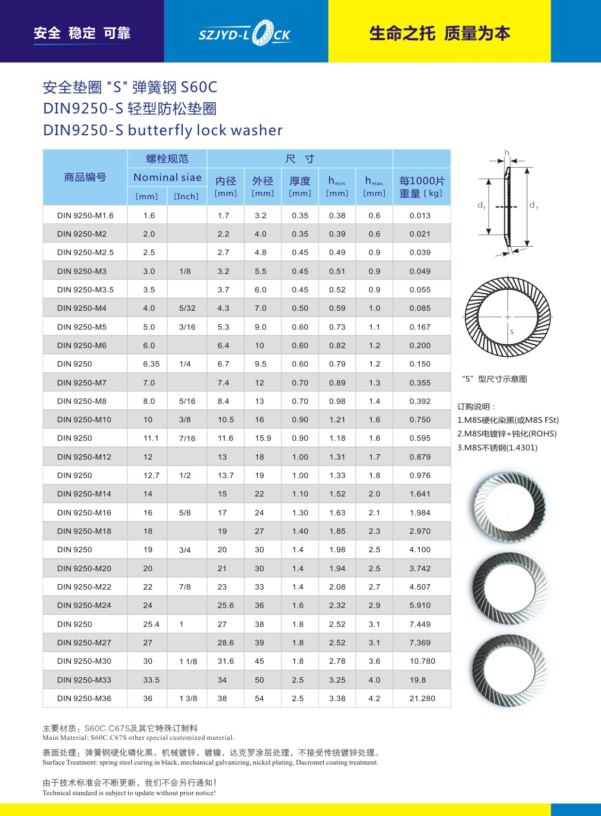 DIN9250防松墊圈、執(zhí)行德國(guó)標(biāo)準(zhǔn)、按螺栓的使用條件分為兩類:8.8級(jí)以下螺栓均選用S輕型安全防松墊圈、10.9級(jí)以上螺栓均先用VS重型安全墊圈系列、