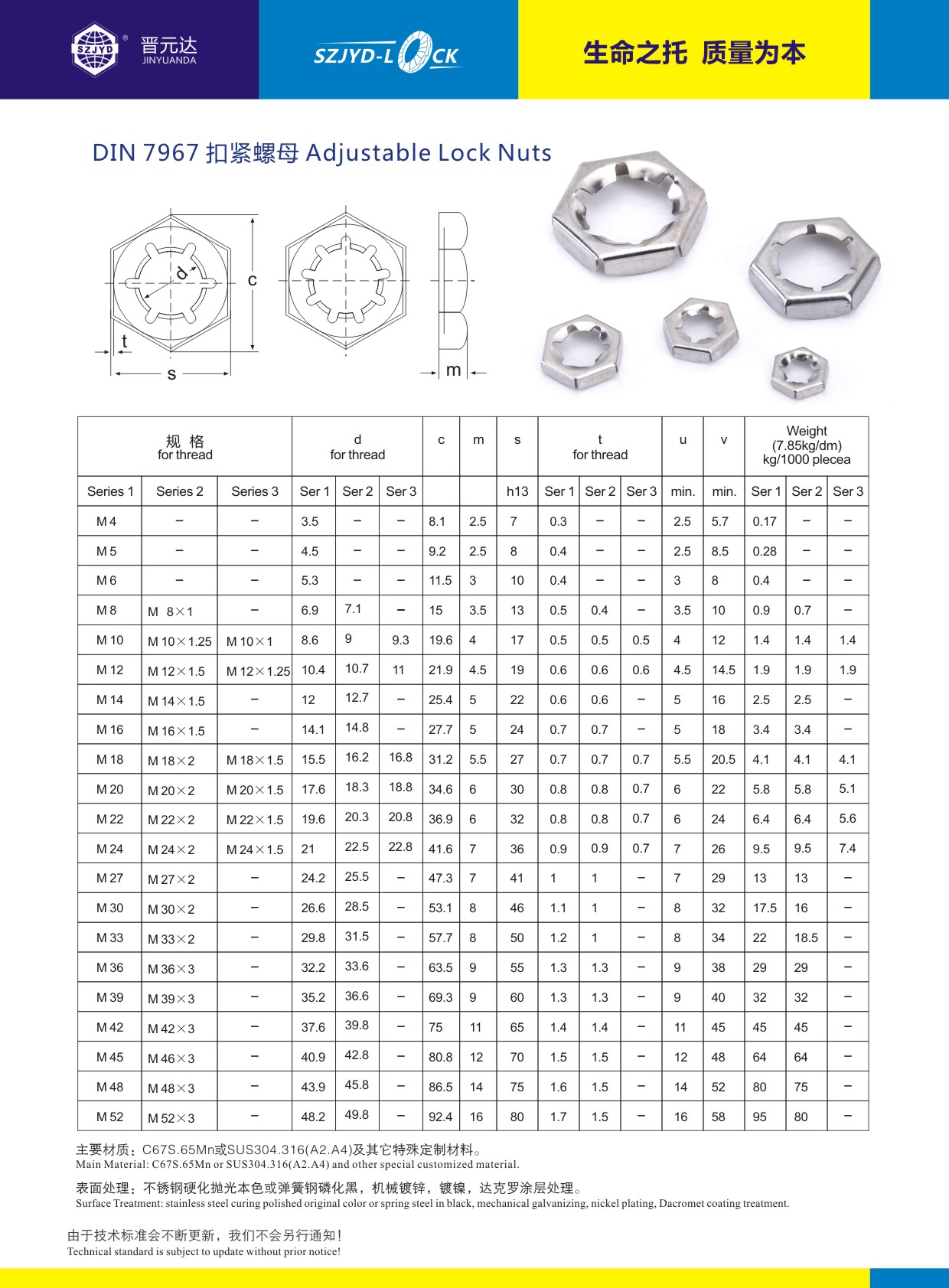 DIN7967扣緊螺母,使用彈簧鋼材質(zhì)生產(chǎn),全硬化表面達(dá)克羅涂覆處理,配合螺母使用,達(dá)到防松止退作用!
