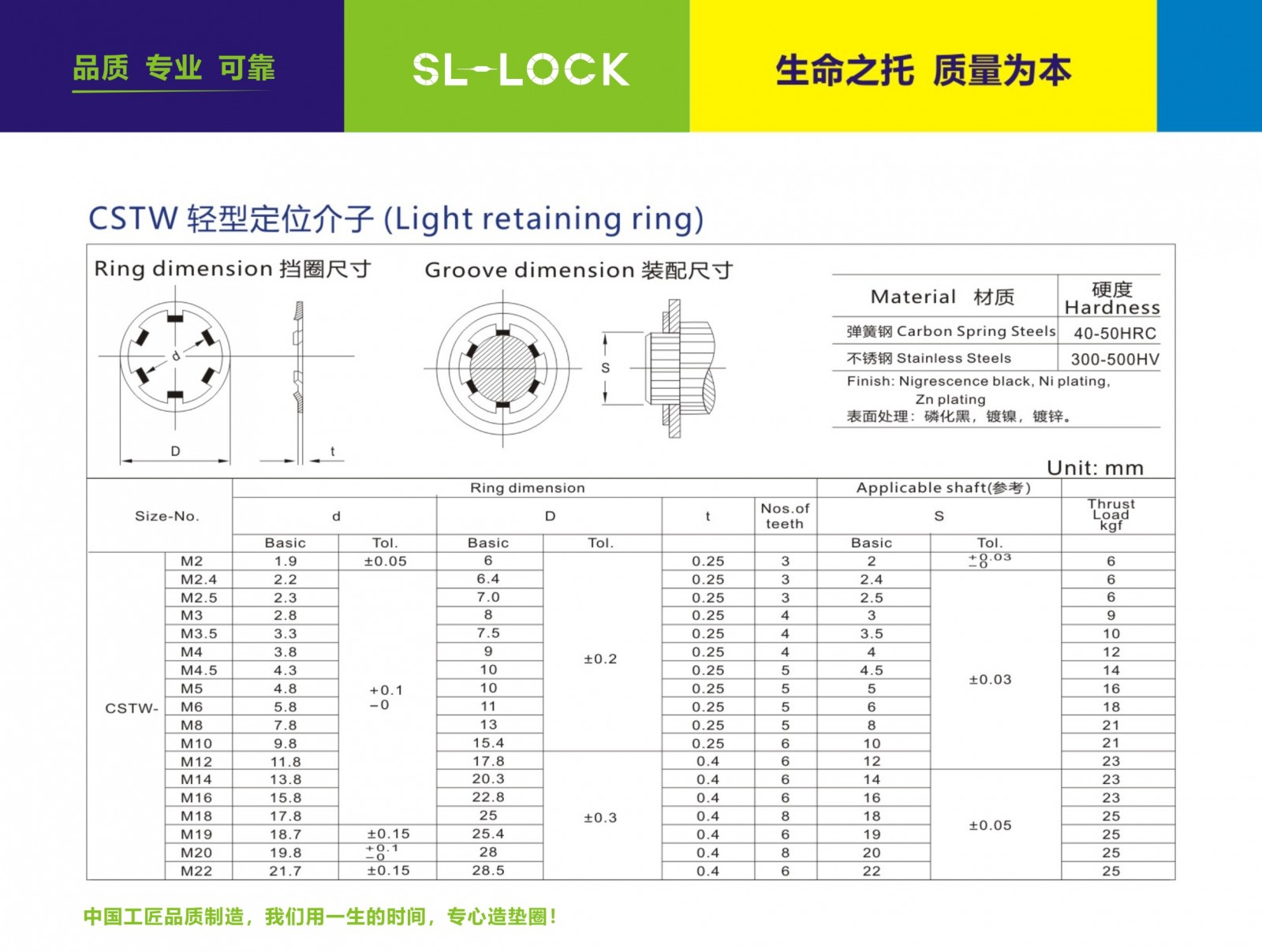 名稱:輕型孔用止動(dòng)墊圈 執(zhí)行標(biāo)準(zhǔn):CRTW 型號(hào):M2-M22 材質(zhì):65MN/C67S 表面處理:磷化黑色