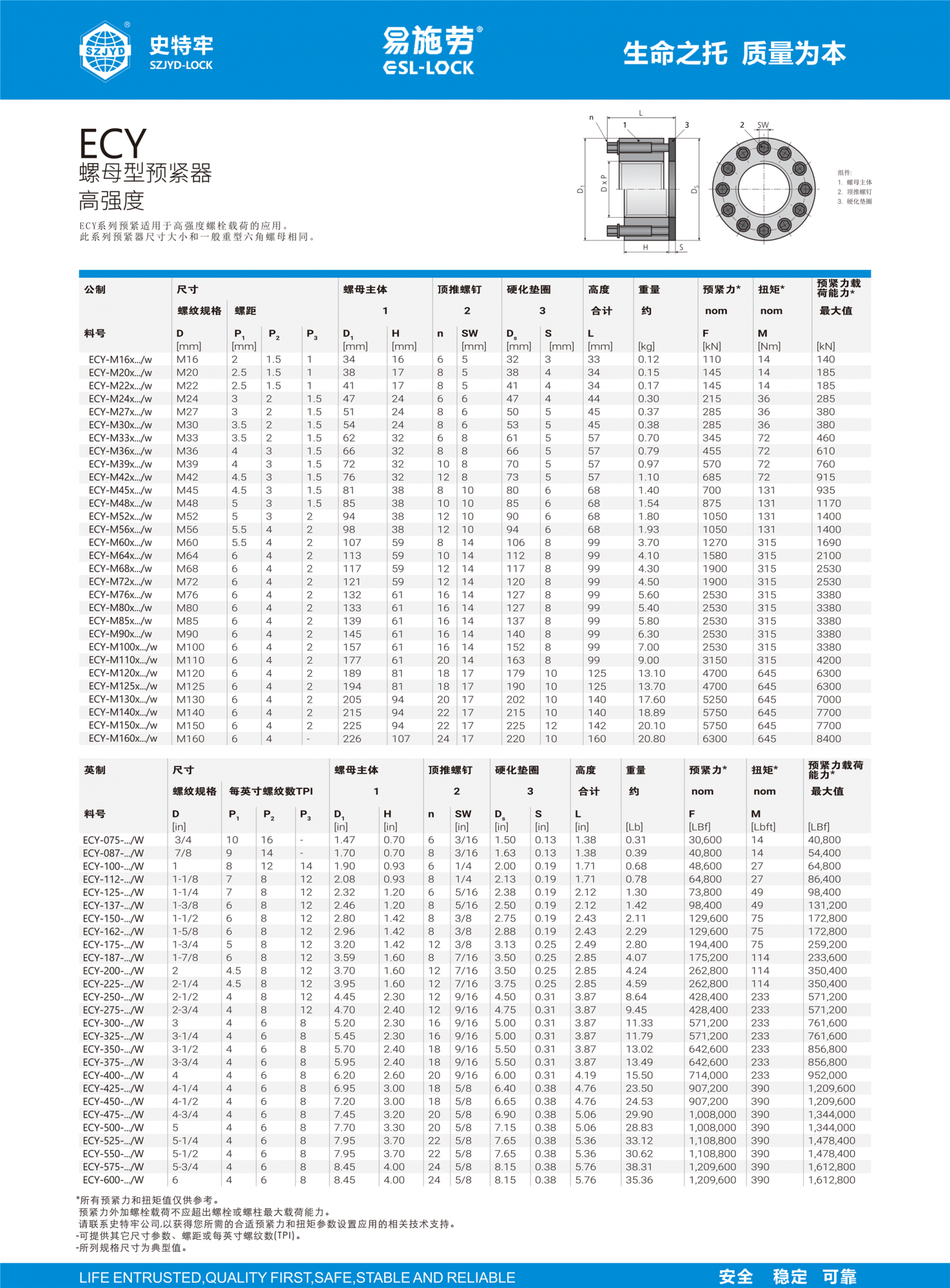 多頂推超級(jí)預(yù)緊器,可在很小空間安裝,使用簡單工具即可輕松預(yù)緊,節(jié)省安裝時(shí)間,ESL-LOCK品牌易施勞超級(jí)螺母具有完全的防松鎖緊功能,可多次拆卸重復(fù)使用。特別適用于M24規(guī)格以上大型螺栓鎖緊!一擰永固,永不松動(dòng)!使用常規(guī)格為合金材料及特殊不銹鋼合金材料以及鎳基合金材料!更多了解歡迎咨詢我們.....