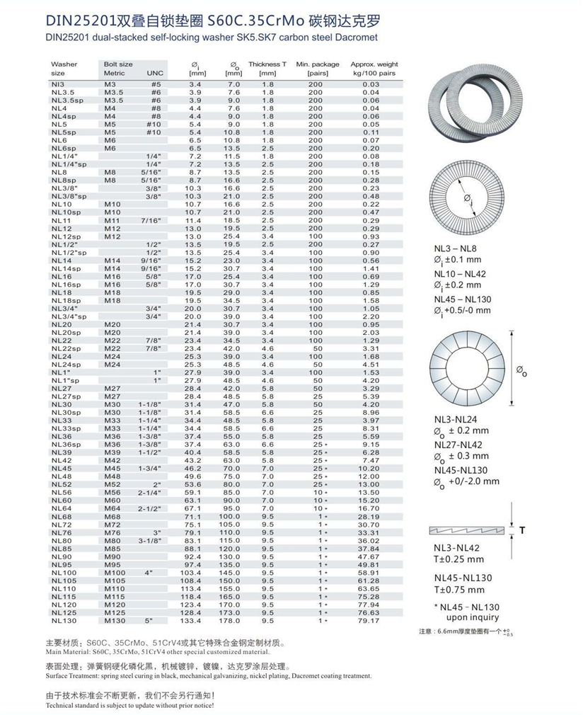 制造工藝:DIN25201標(biāo)準(zhǔn)墊圈全部使用S60C/SK5及特殊合金鋼材質(zhì)、經(jīng)過全硬化處理HRC45-52、硬度等級14.9級!
