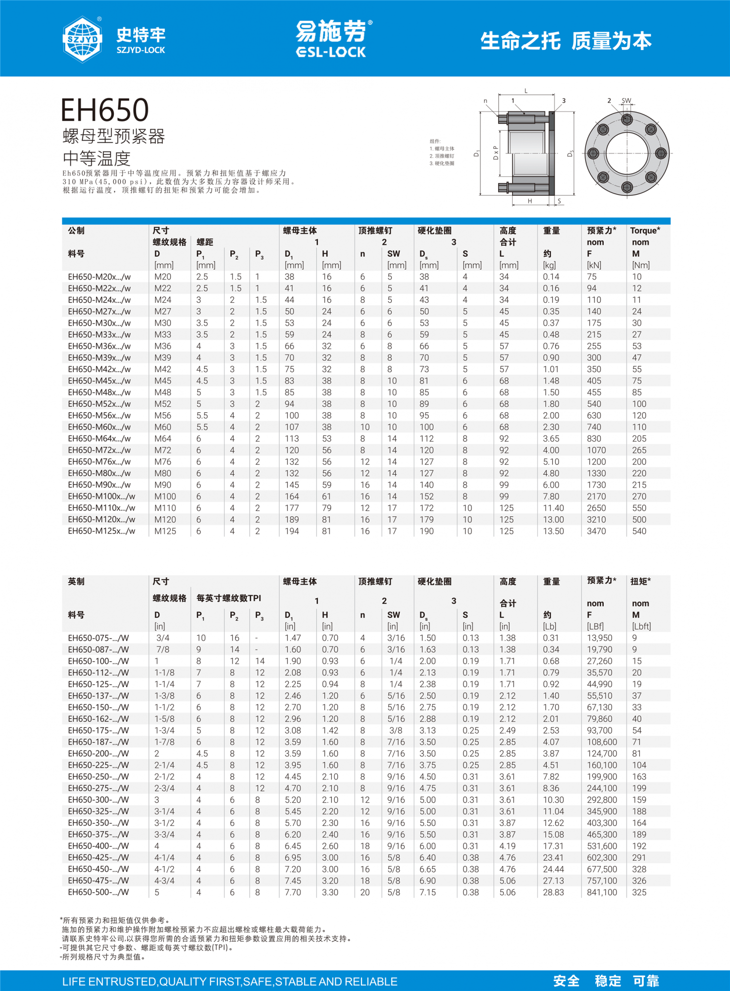 多頂推超級(jí)預(yù)緊器,可在很小空間安裝,使用簡(jiǎn)單工具即可輕松預(yù)緊,節(jié)省安裝時(shí)間,ESL-LOCK品牌易施勞超級(jí)螺母具有完全的防松鎖緊功能,可多次拆卸重復(fù)使用。特別適用于M24規(guī)格以上大型螺栓鎖緊!一擰永固,永不松動(dòng)!使用常規(guī)格為合金材料及特殊不銹鋼合金材料以及鎳基合金材料!更多了解歡迎咨詢我們.....
